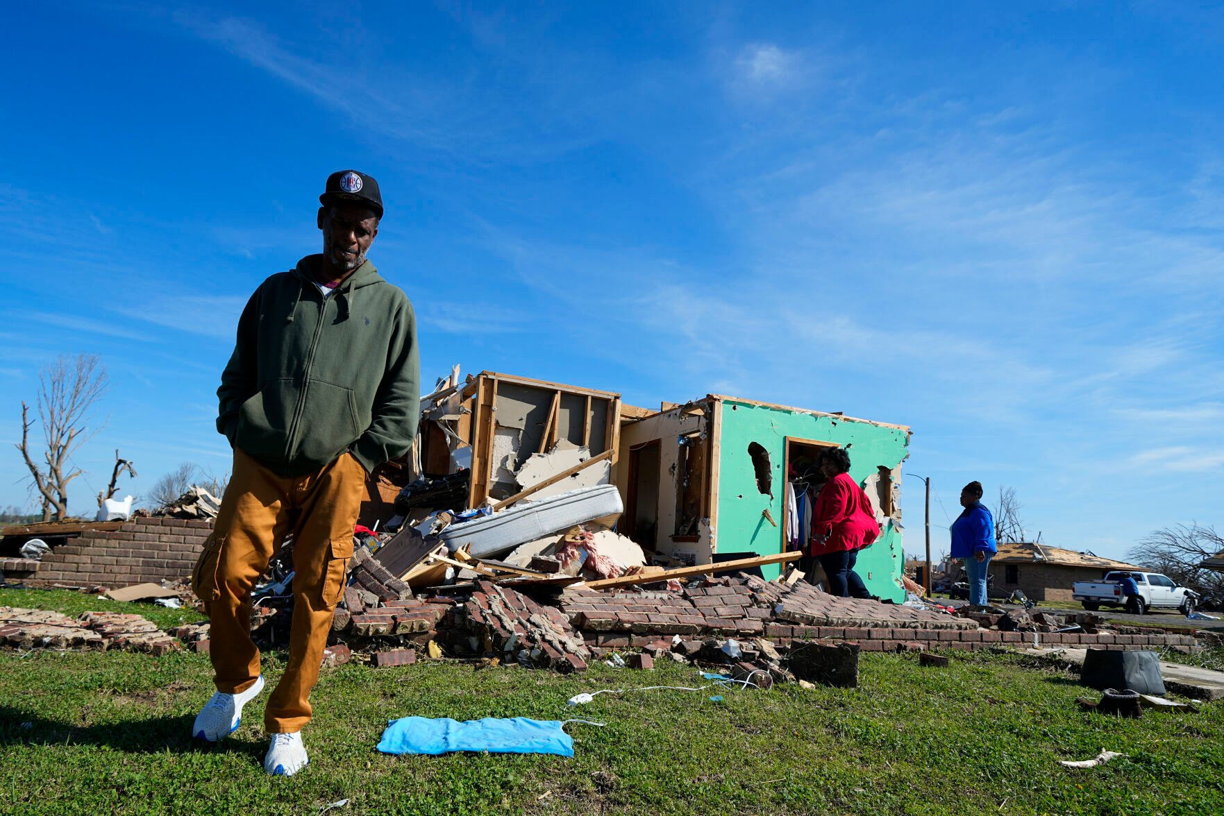 Jermaine Wells, neighbor of Lonnie and Melissa Pierce, who were killed when a truck landed on their house during a tornado, walks near Wells' home Monday in Rolling Fork, Miss.