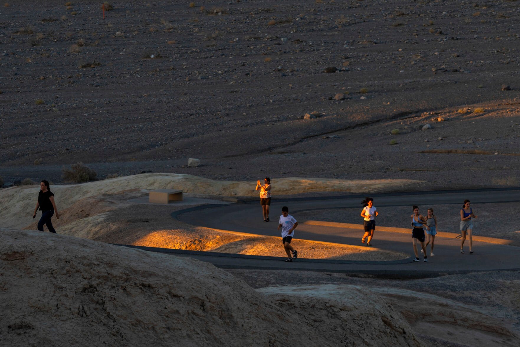 People run to get sunset photos at Zabriskie Point on Saturday, July 8, 2023, in Death Valley National Park, Calif. July is the hottest month at the park with an average high of 116 degrees (46.5 Celsius). (AP Photo/Ty ONeil)