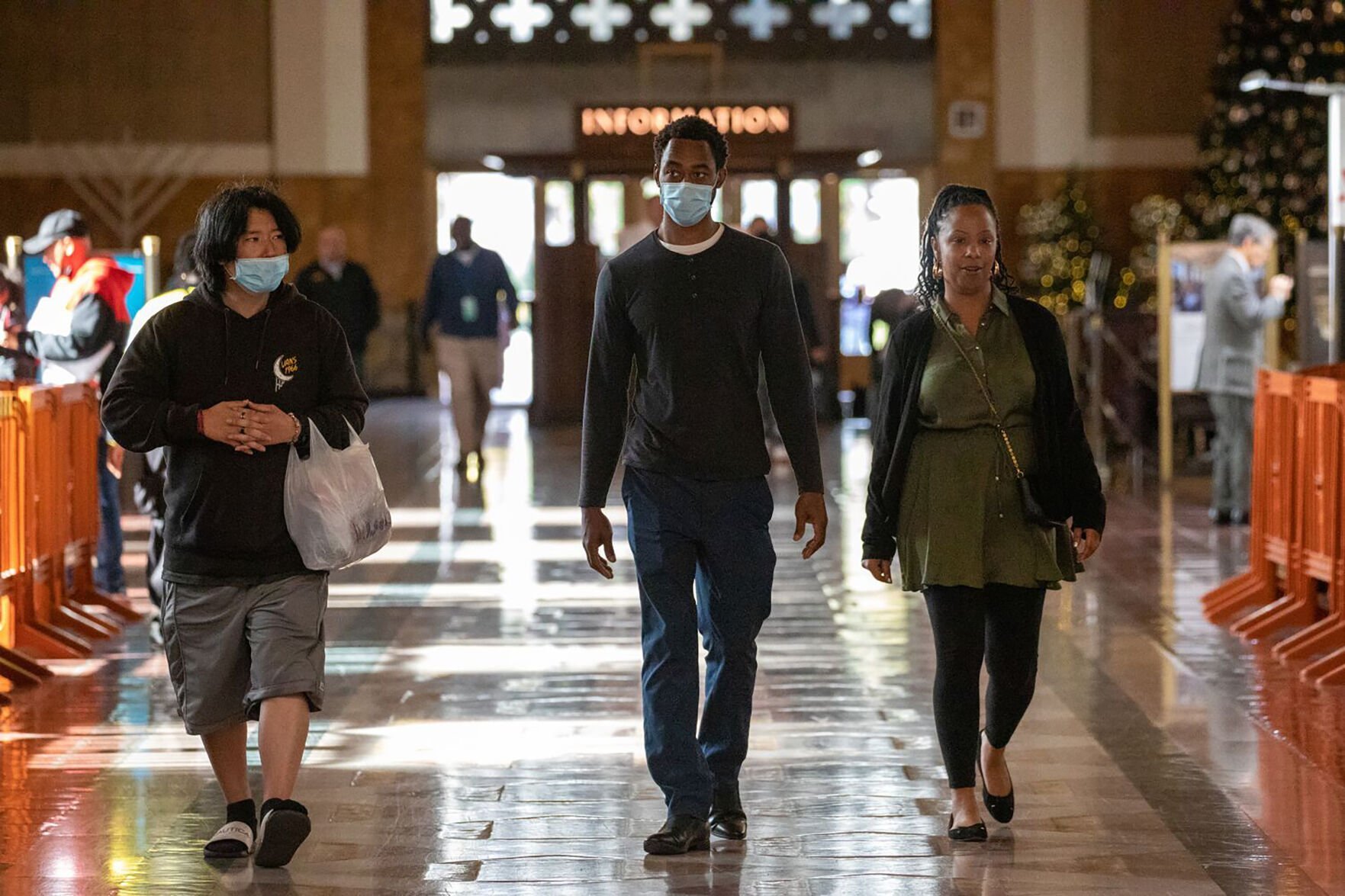 Commuters wear masks during a surge in the COVID-19 pandemic on Dec. 6, 2022, in Los Angeles.