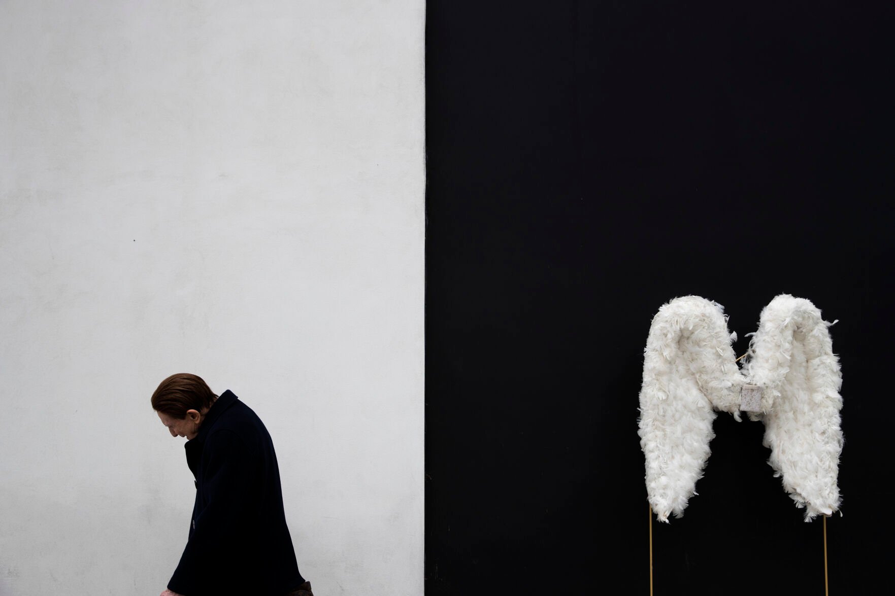 <p>FILE - A man walks by a pair of angel wings displayed in a store in Beverly Hills, Calif., on Tuesday, May 7, 2019 (AP Photo/Jae C. Hong, File)</p>