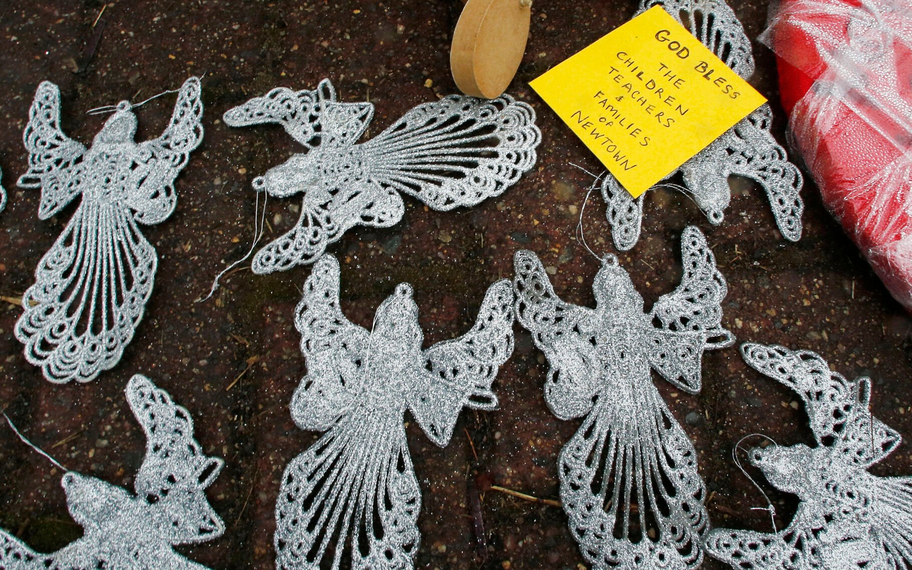 <p>FILE - Angels and a note blessing victims rest on the ground at the site of a makeshift memorial for school shooting victims at the village of Sandy Hook in Newtown, Conn., Sunday, Dec. 16, 2012. A gunman opened fire at Sandy Hook Elementary School in the town, killing 26 people, including 20 children before killing himself. (AP Photo/Charles Krupa, File)</p>