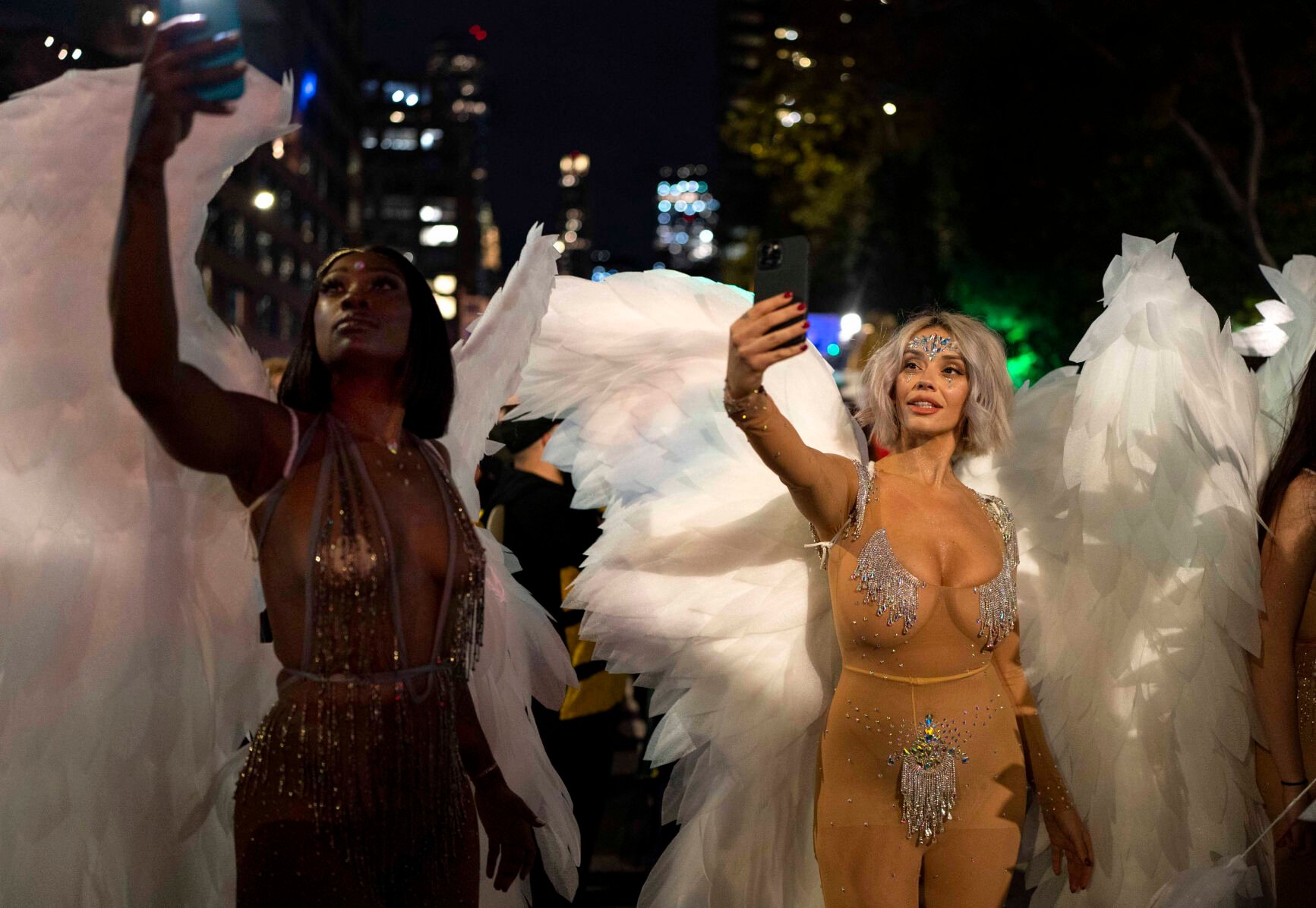 FILE - Costumed Halloween revelers take pictures with their phones before the start of New York City's 48th annual Greenwich Village Halloween Parade, Sunday, Oct. 31, 2021, in New York. (AP Photo/Dieu-Nalio Chery, File)