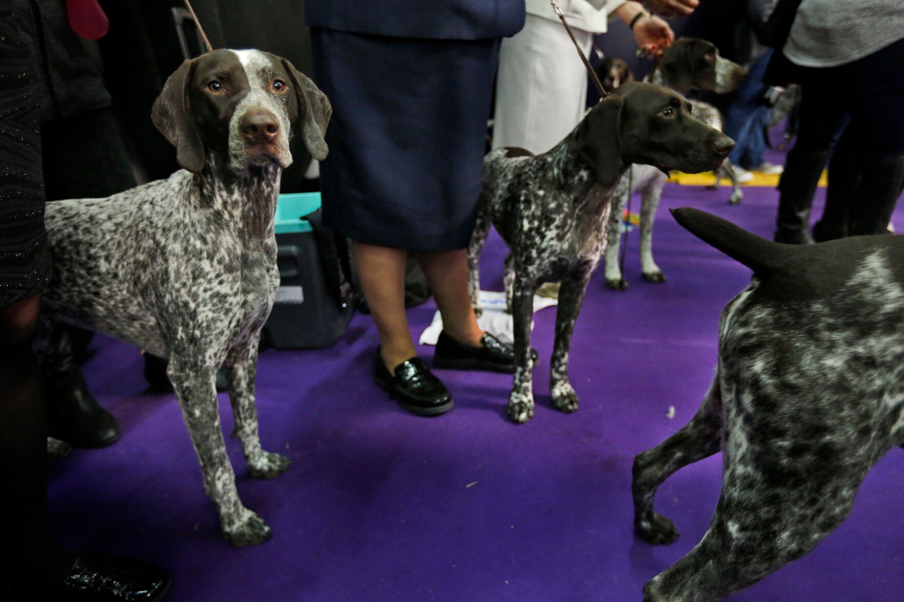 FILE - German shorthaired pointers wait to enter the ring during the 142nd Westminster Kennel Club Dog Show in New York, Tuesday, Feb. 13, 2018. To the casual viewer, competing at the Westminster Kennel Club dog show might look as simple as getting a dog, grooming it and leading it around a ring. But there's a lot more to getting to and exhibiting in the United States' most prestigious canine event. (AP Photo/Seth Wenig, File)