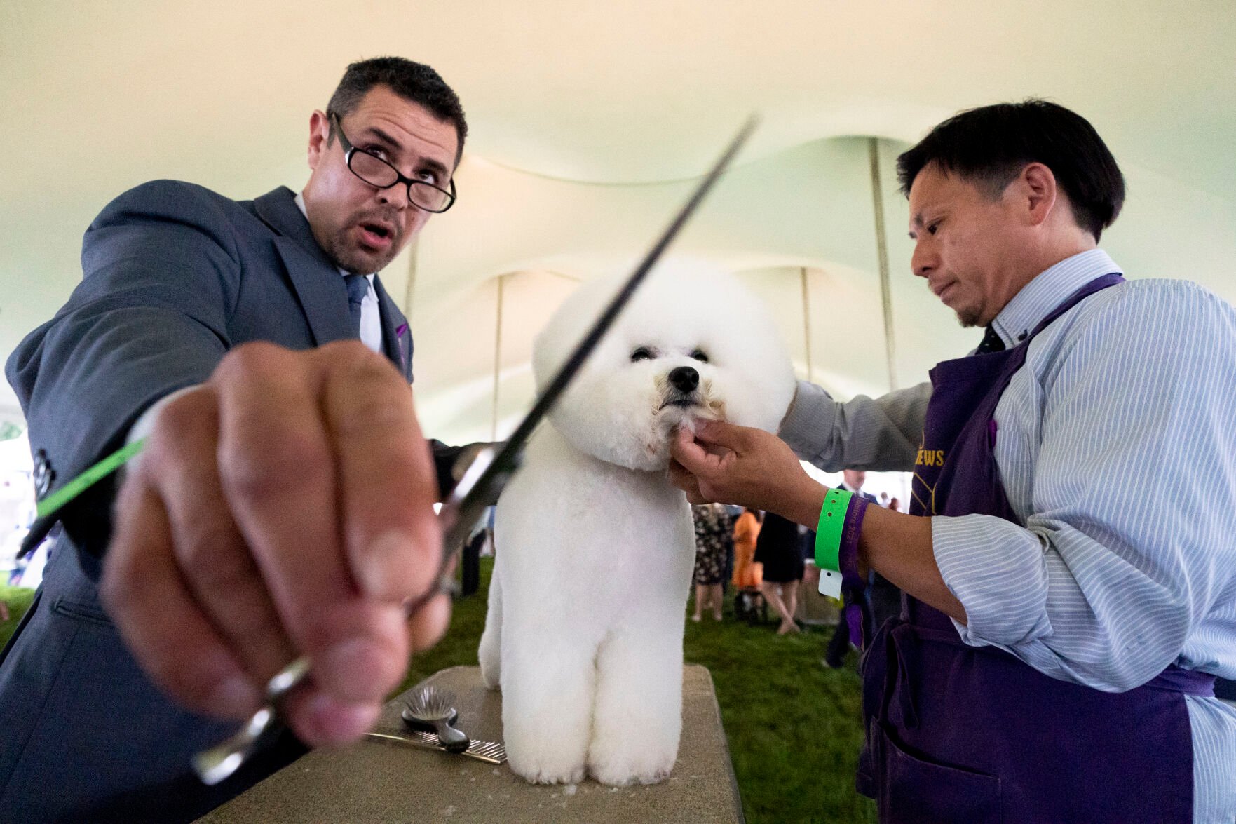 FILE - A bichon frise is groomed in the staging area in the tented judging area at the 145th Annual Westminster Kennel Club Dog Show, Saturday, June 12, 2021, in Tarrytown, N.Y. To the casual viewer, competing at the Westminster Kennel Club dog show might look as simple as getting a dog, grooming it and leading it around a ring. But there's a lot more to getting to and exhibiting in the United States' most prestigious canine event. (AP Photo/John Minchillo, File)