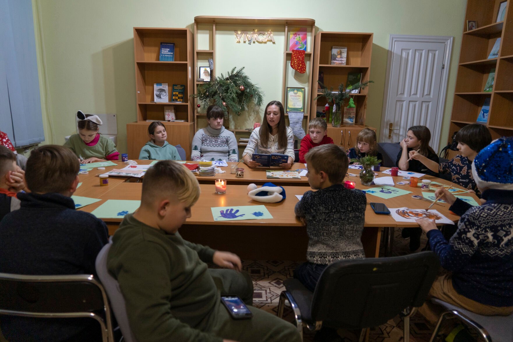 As Bice waited in a hallway, inside of what looked like a school classroom with paintings and some books, a dozen children were seated around a table listening to Oksana Sliepova, a psychologist.