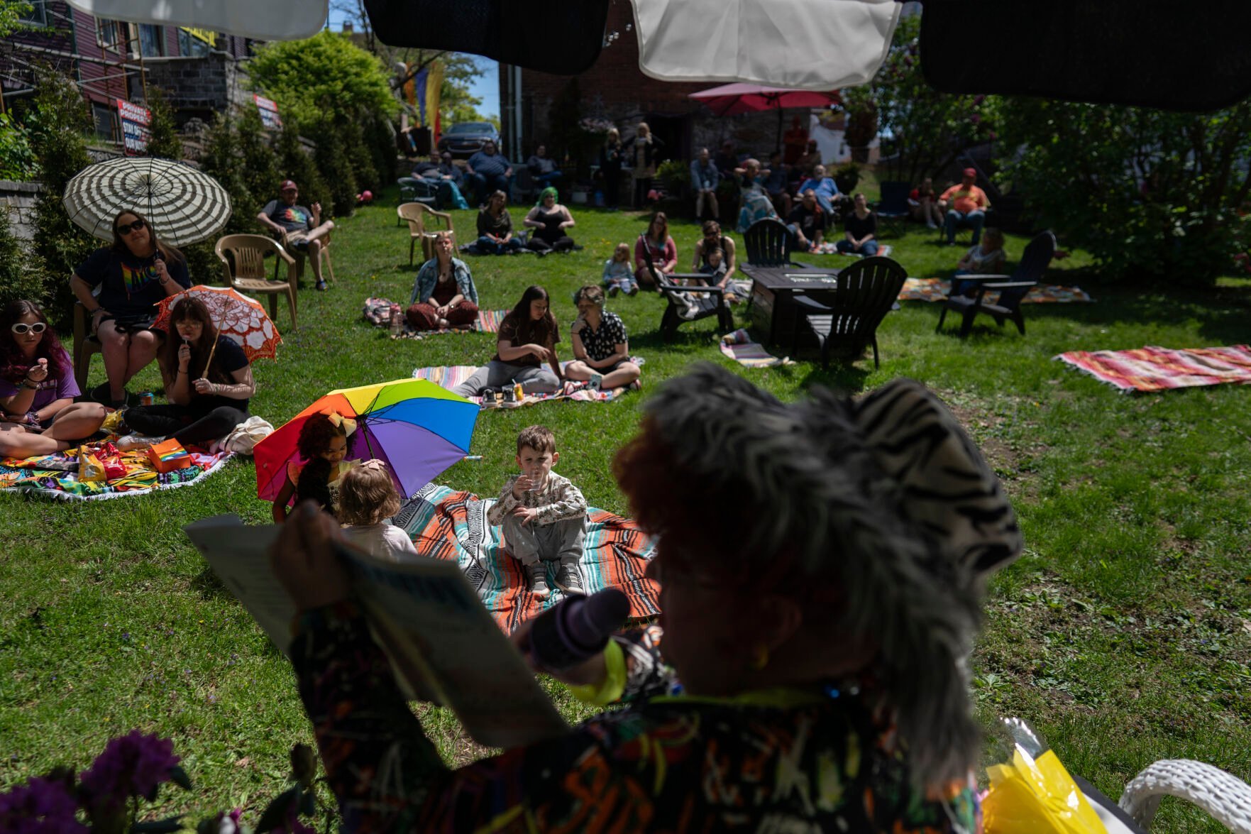 Carolyn KasterDrag queen Alexus Daniels reads "Coat of Many Colors" by Dolly Parton to children, their families, and friends at "Drag Storytime!" in Mt. Carmel, Pa., in the garden at the Pink Moon Collective, Saturday, May 6, 2023. (AP Photo/Carolyn Kaster)