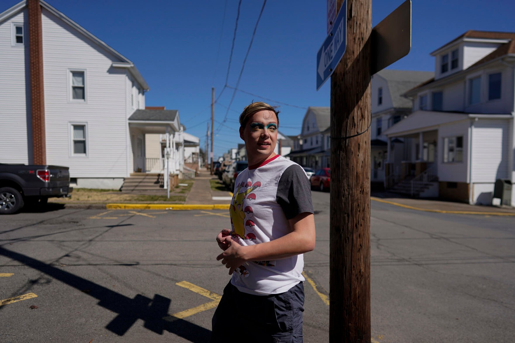 Trixy Valentine, aka Jacob Kelley, walks in street clothes and makeup after performing at the "Spring Fever Drag Brunch" on March 26 at the Kulpmont Winery in Kulpmont, Pa.