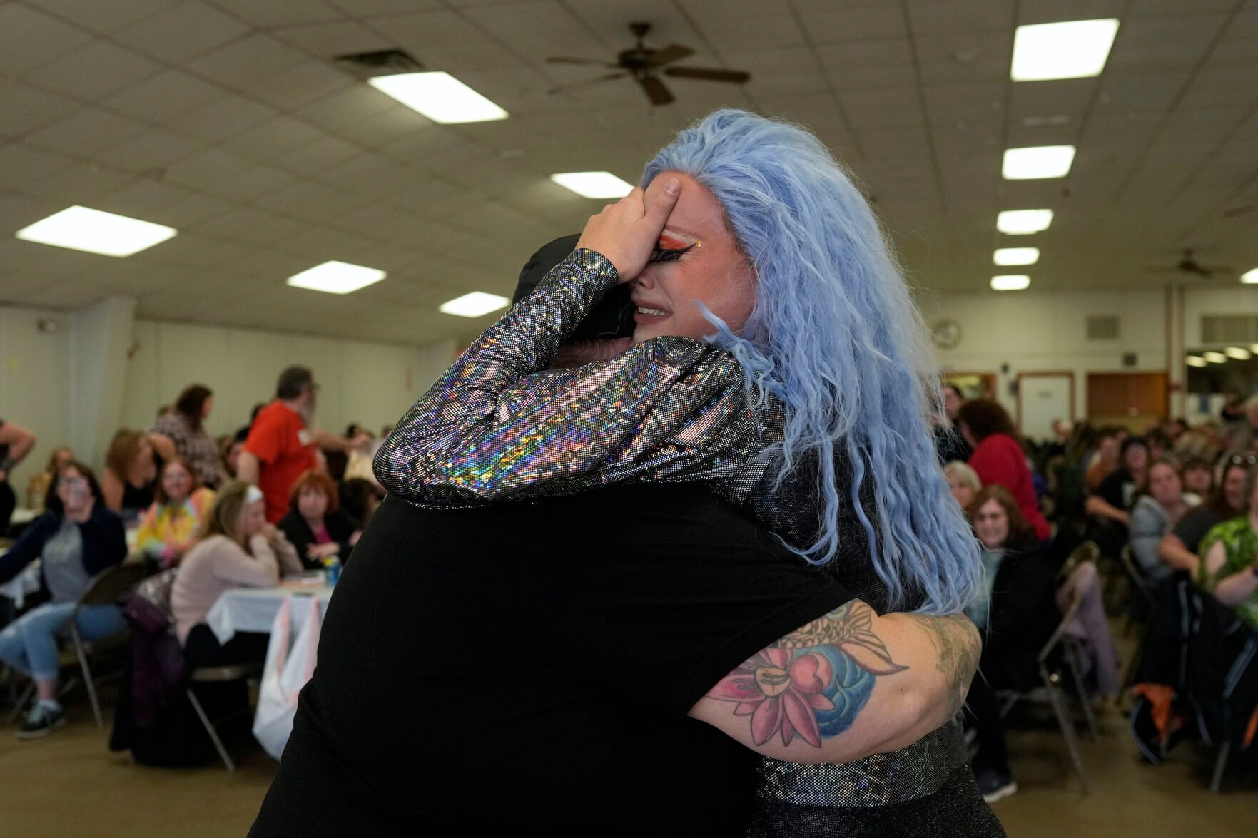 Drag queen Trixy Valentine, aka Jacob Kelley, cries in the arms of DJ Corrine after performing their drag story mix at a "Drag Bingo" fundraiser at the Nescopeck Township Volunteer Fire Company Social Hall, in Nescopeck, Pa., Saturday, March 18, 2023. Trixy's emotional performance received a standing ovation. (AP Photo/Carolyn Kaster)