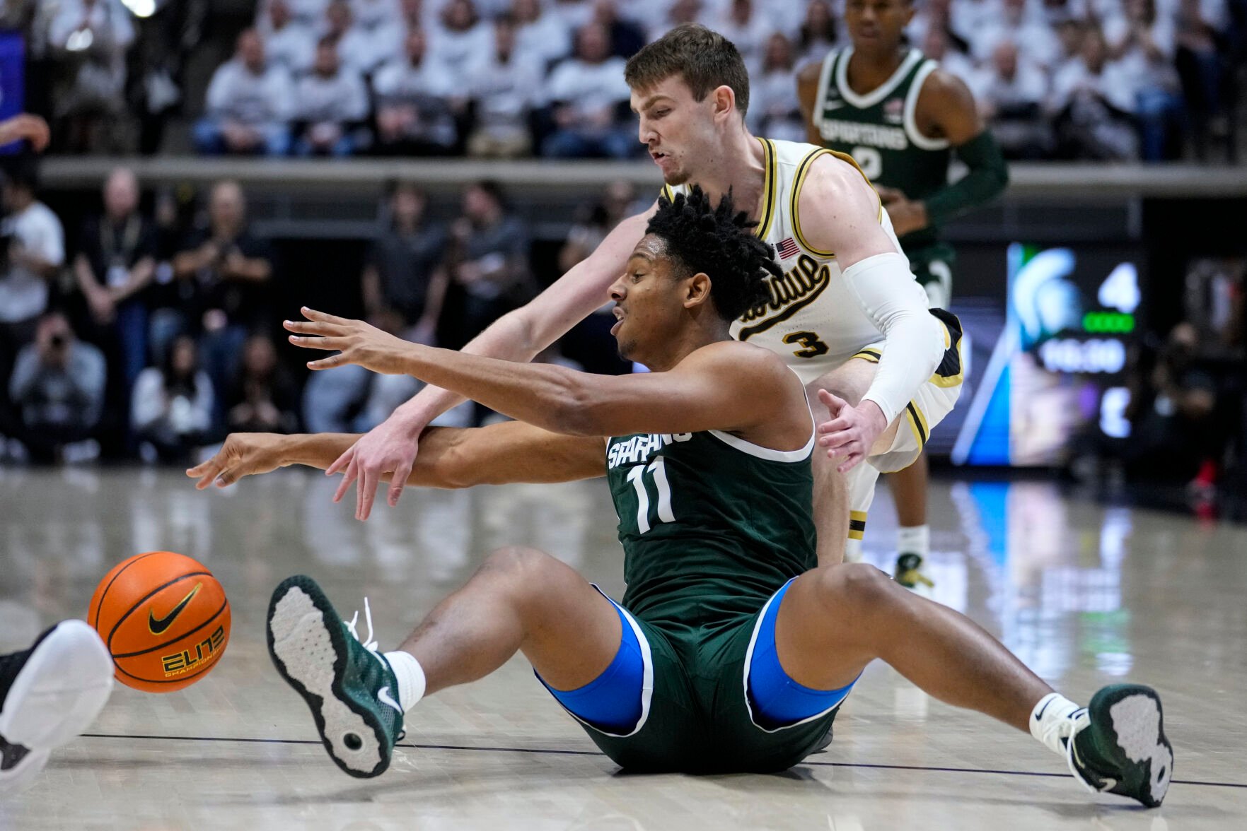 Michigan State guard A.J. Hoggard, sitting, and Purdue guard Braden Smith go for a loose ball during the first half of Sunday's game in West Lafayette, Ind.
