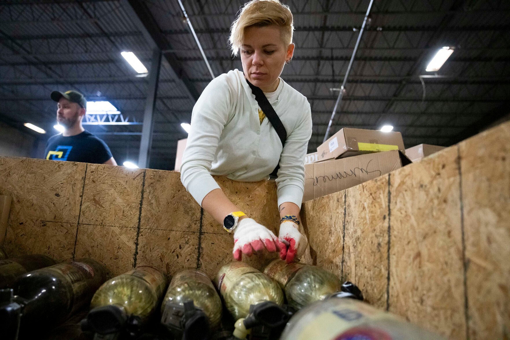 Volunteers with Razom for Ukraine, a New York-based nonprofit, load oxygen tanks into a container as they pack firefighting and medical donations for shipment to Ukraine on Feb. 8 in Woodbridge Township, N.J.