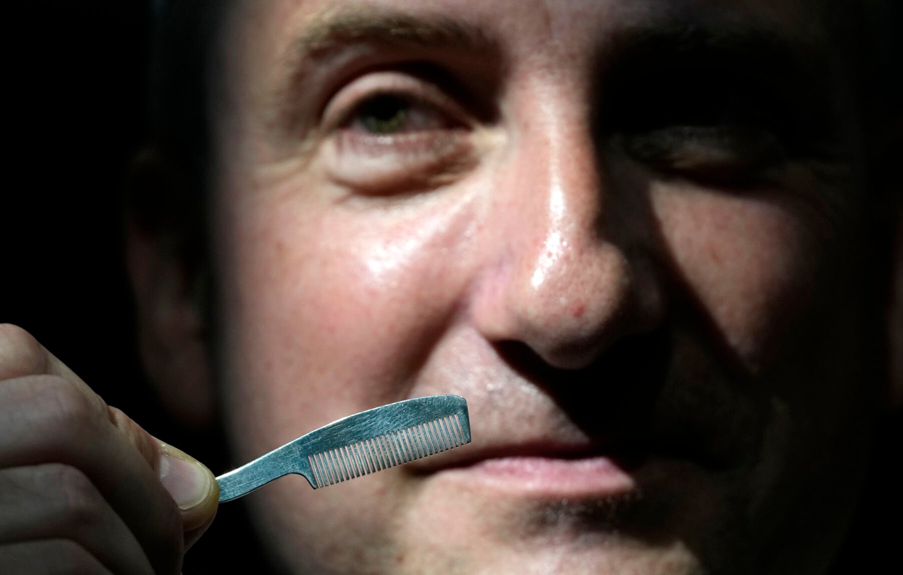 A Sotheby's employee displays a moustache comb from Freddie Mercury's personal items at Sotheby's auction rooms in London on Aug. 3, 2023.
