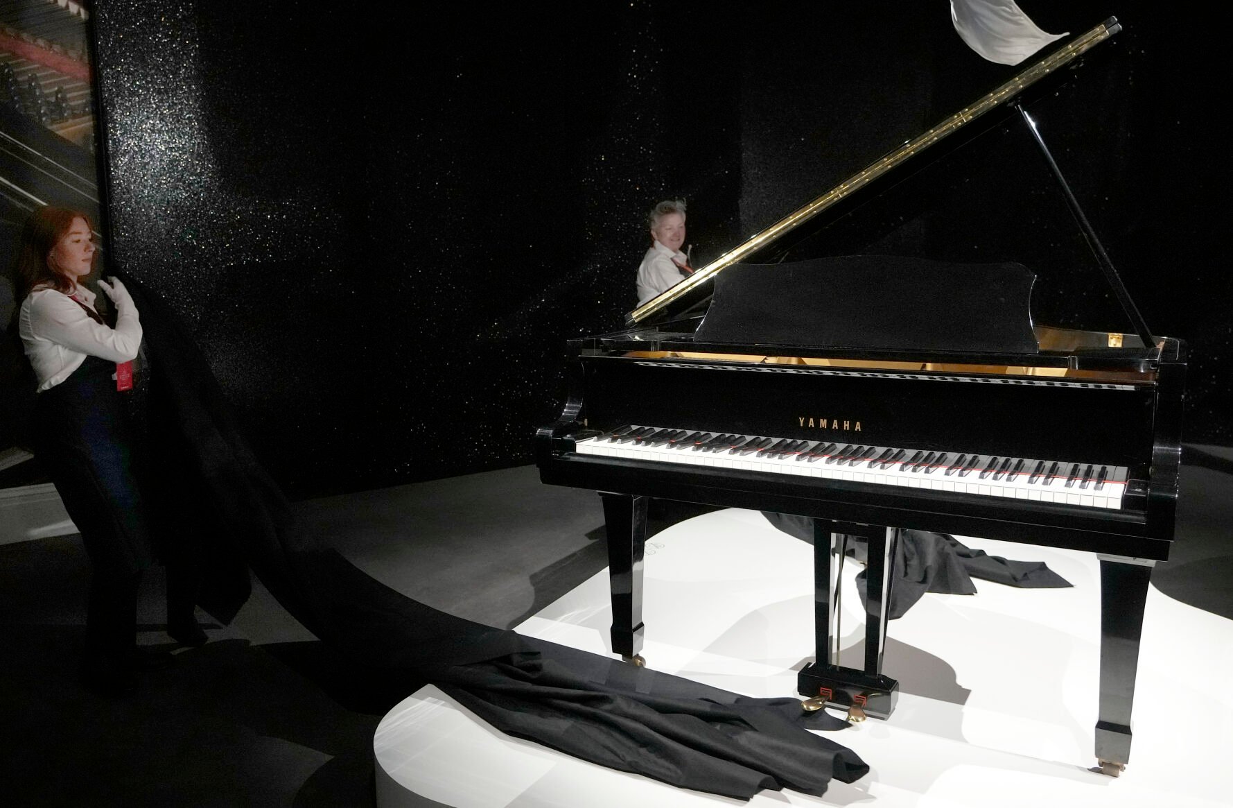 Freddie Mercury's Yamaha Grand Piano on display at Sotheby's auction rooms in London on Aug. 3, 2023.