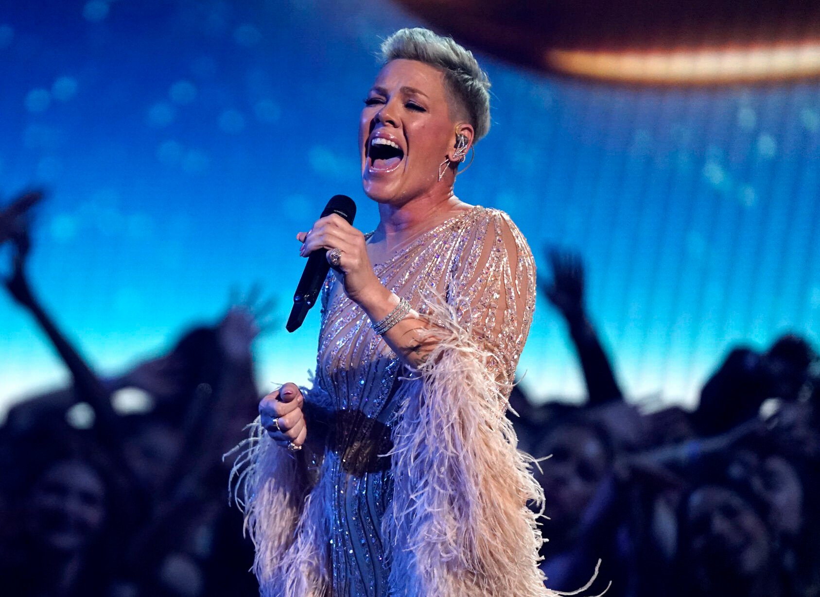 <p>FILE - Pink performs at the American Music Awards in Los Angeles on Nov. 20, 2022. At a Pink concert recently, a fan tossed their mother’s ashes onto the stage as she was performing. (AP Photo/Chris Pizzello, File)</p>
