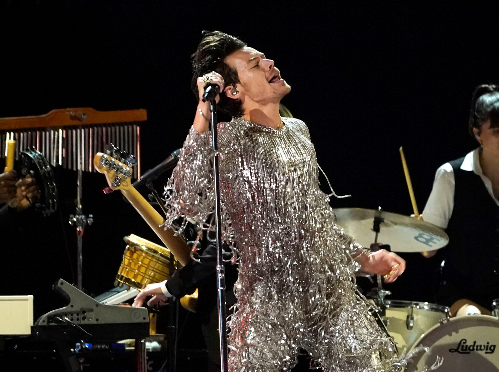 <p>FILE - Harry Styles performs at the 65th annual Grammy Awards in Los Angeles on Feb. 5, 2023. The singer was hit in the eye by a projectile during a concert in November of 2022. (AP Photo/Chris Pizzello, File)</p>