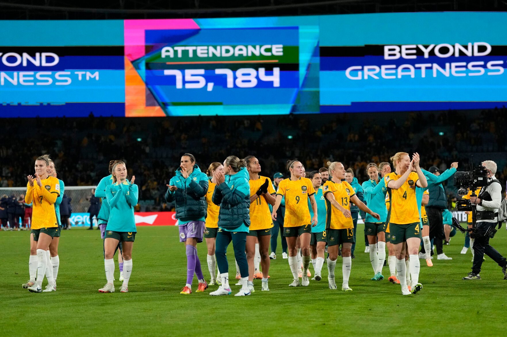 Australia's players leave the pitch after winning the Women's World Cup round of 16 soccer match between Australia and Denmark at Stadium Australia in Sydney, Australia, Monday, Aug. 7, 2023. (AP Photo/Rick Rycroft)