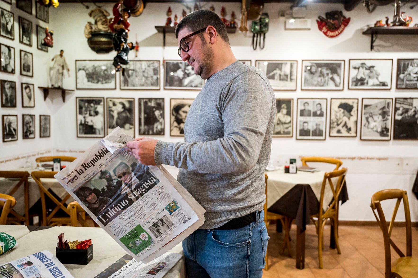 Roberto Cottone, owner of a restaurant and member of the association "Farewell Pizzo" reads a newspaper Tuesday in Palermo, Italy.
