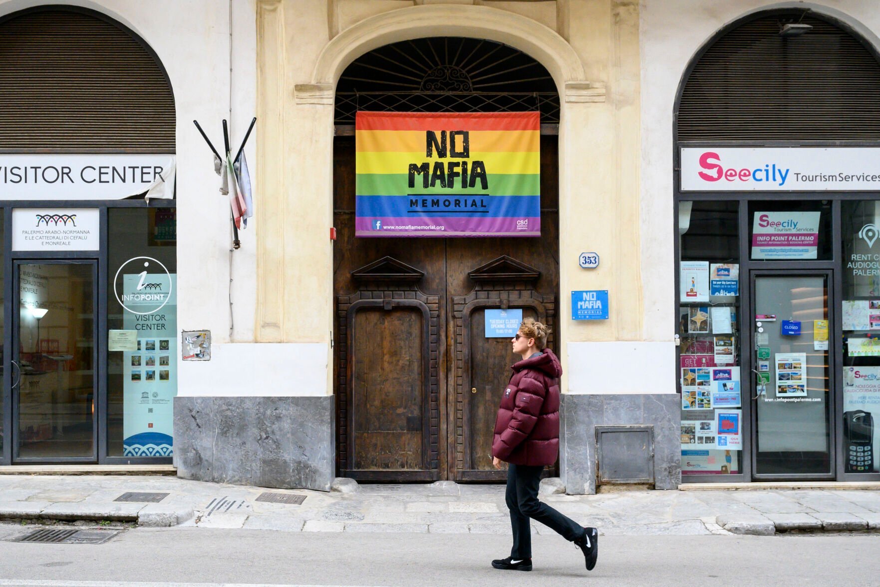 A man walks past a flag that reads "No Mafia" Tuesday in Palermo, Italy.