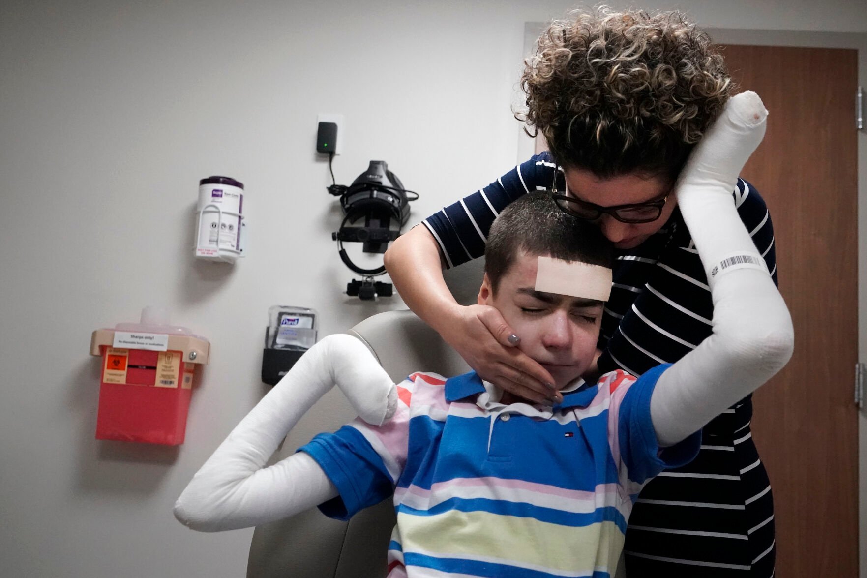 Yunielkys Carvajal, gives her son, Antonio Vento Carvaja, a hug and a kiss after a doctor's visit, Thursday, July 6, 2023, at University of Miami Health System's Bascom Palmer Eye Institute in Miami.Â