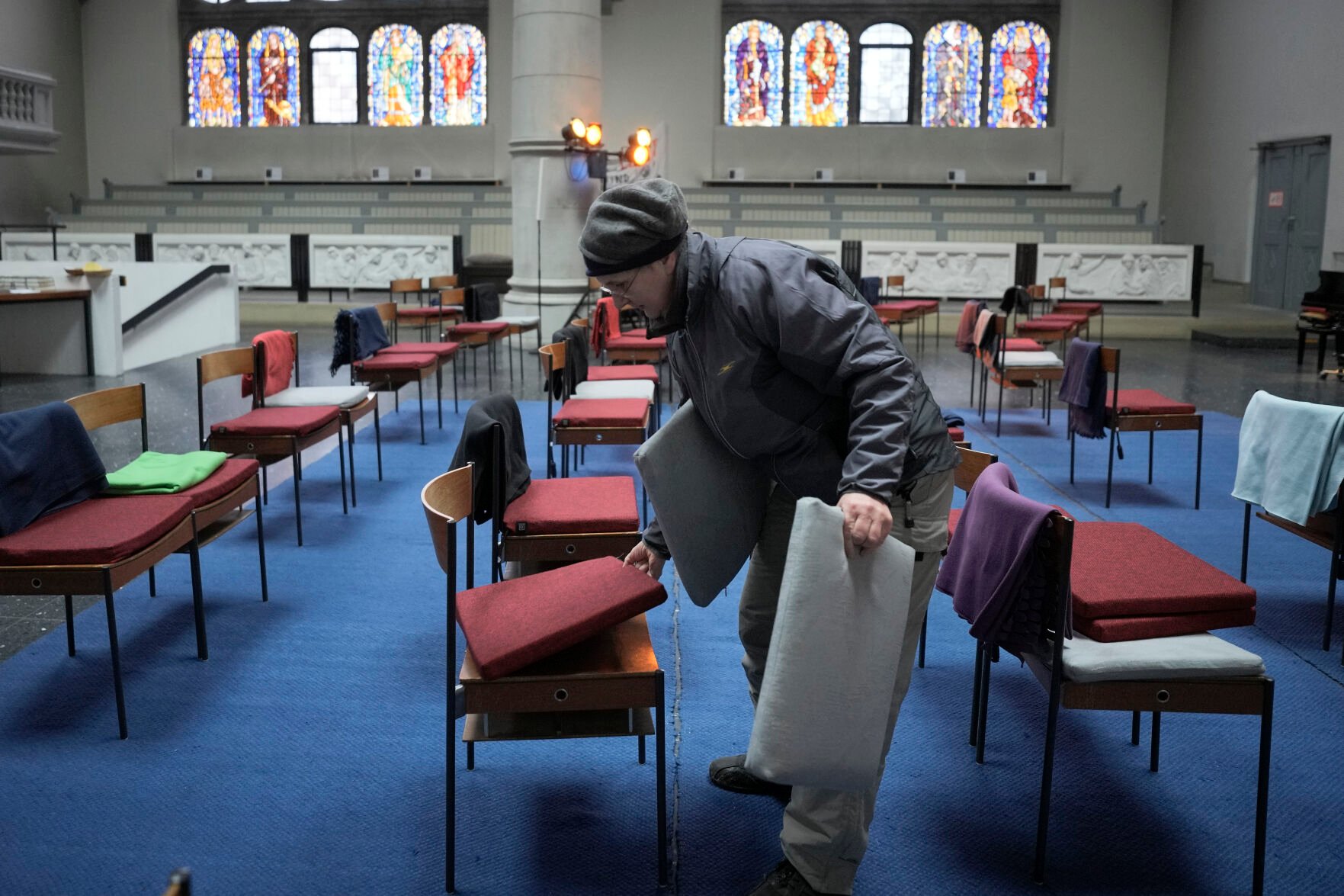 A employee places heated cushions on chairs prior to a service at the Martha-Church Congregation on Dec. 18 in Berlin, Germany, Sunday.