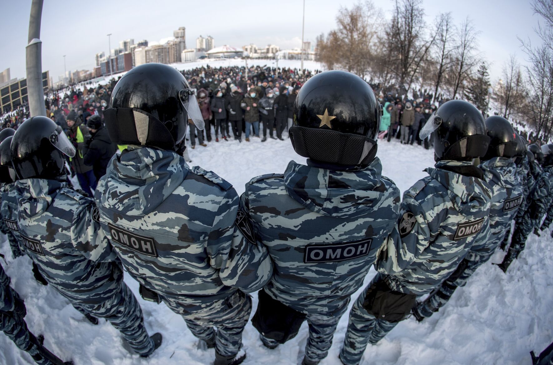 <p>Police on Jan. 23, 2021, block a protest against the jailing of opposition leader Alexei Navalny in Yekaterinburg, Russia.</p>