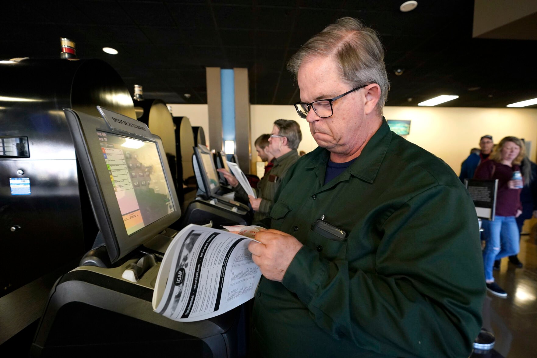 Robin Hannan, of Romeoville, Ill., looks over his wagers at the Iowa Greyhound Park, Saturday, April 16, 2022, in Dubuque, Iowa.