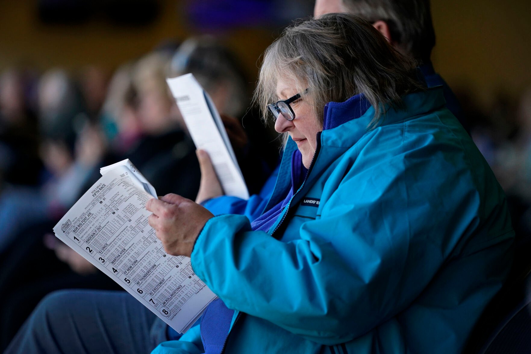 Peggy Janiszewski looks over a race program at the Iowa Greyhound Park, Saturday, April 16, 2022, in Dubuque, Iowa.