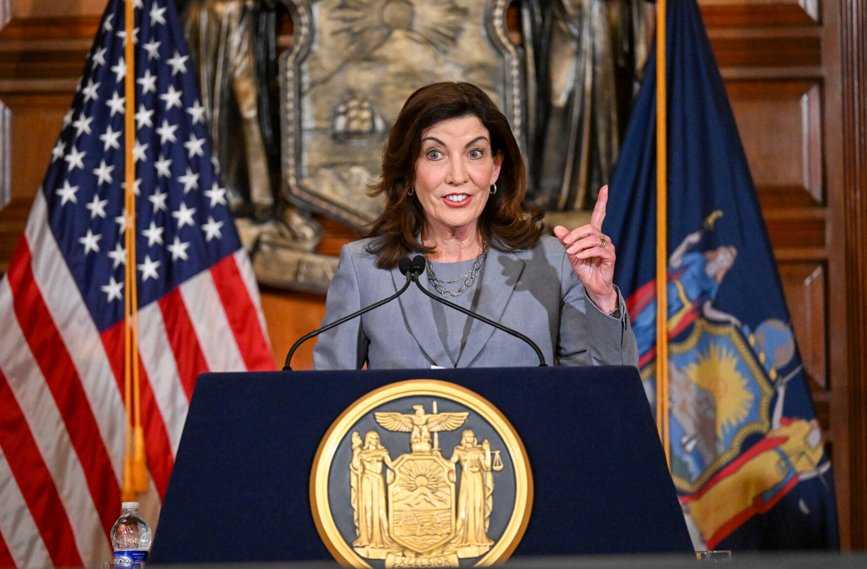 New York Gov. Kathy Hochul speaks to reporters about legislation passed during a special legislative session in the Red Room at the state Capitol, Friday, July 1, 2022, in Albany, N.Y.Â