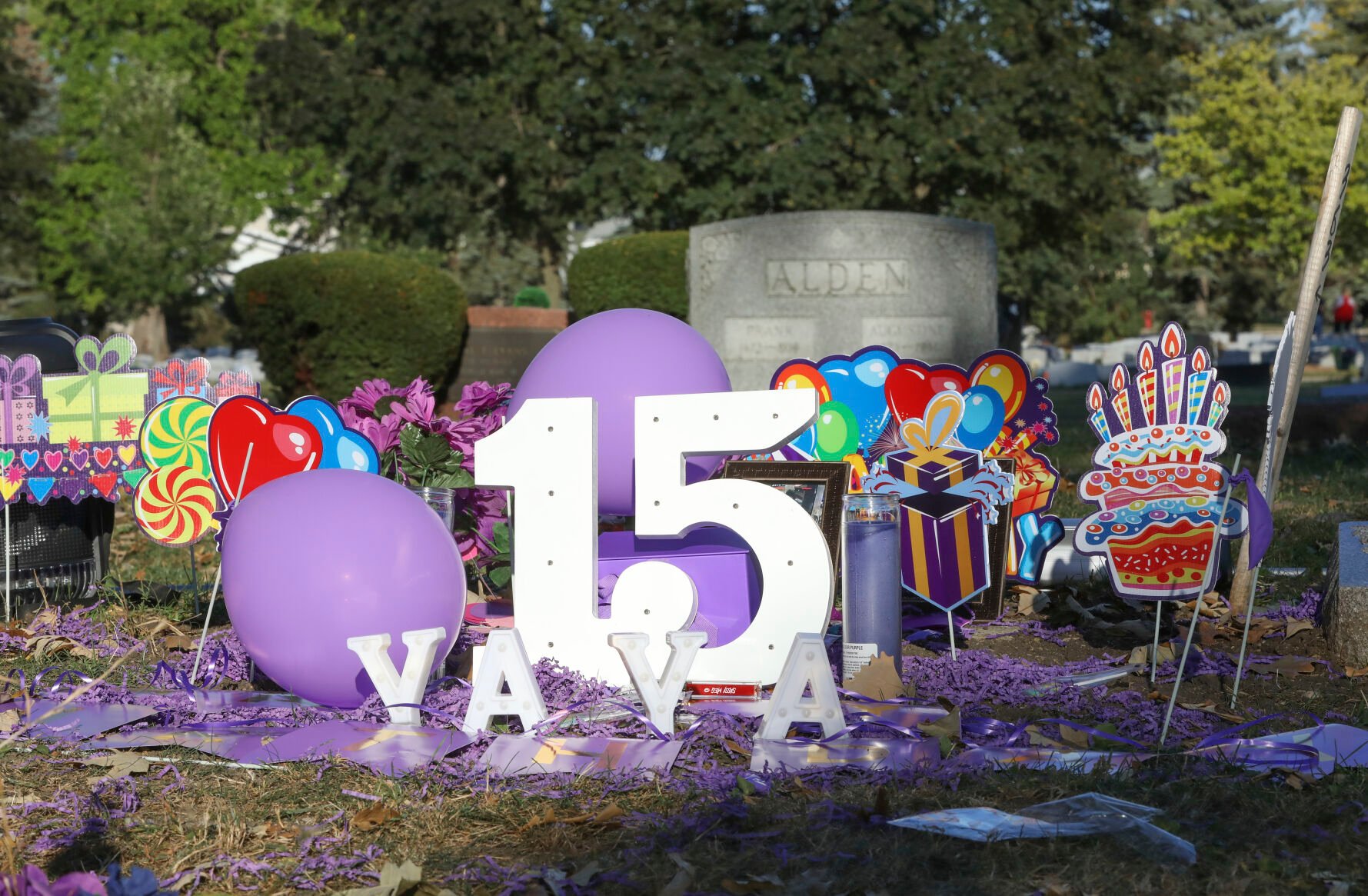 Amaria Jones's grave in Hillside, Ill,, is decorated for what would have been her 15th birthday on Saturday, Sept. 18, 2021. Gun violence is killing an increasing number of American children, many of them caught in crossfire. When a stray bullet pierced the window of a Chicago home in 2020, it hit and killed 13-year-old Amaria as she danced for her mother. (AP Photo/Teresa Crawford)