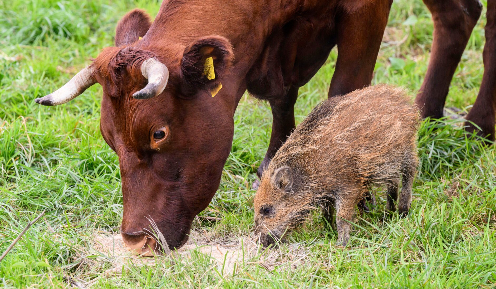 Wild boar Frieda runs between two cows on a pasture near the river Weser in the district of Holzminden, Germany, on Thursday.