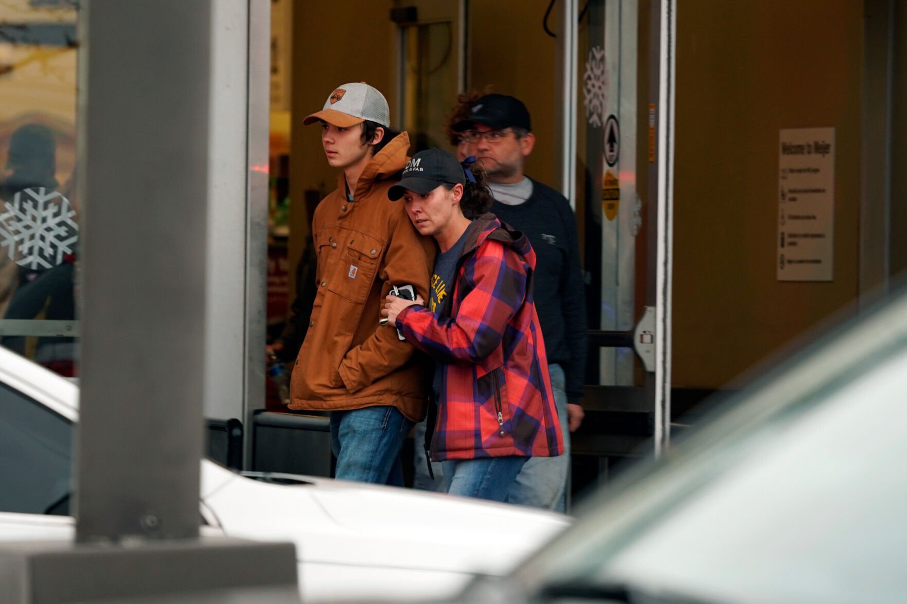 Parents walk away with their kids from the Meijer's parking lot, where many students gathered following an active shooter situation at Oxford High School, Tuesday, Nov. 30, 2021, in Oxford, Mich. (Eric Seals/Detroit Free Press via AP)