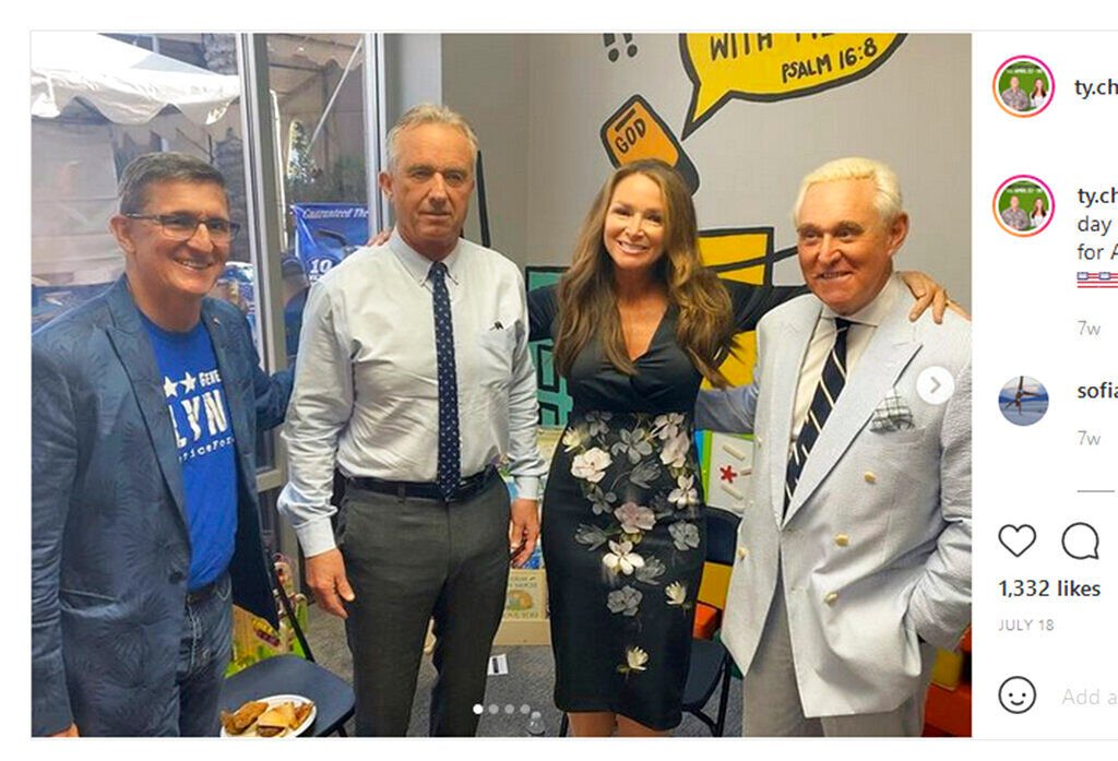 This photo posted on Instagram on July 18, 2021 shows Robert F. Kennedy, Jr., second left, with former National Security Adviser Michael Flynn, left, anti-vaccine profiteer Charlene Bollinger and former President Donald Trump ally Roger Stone, right. The account, run by Bollinger, has since been removed.