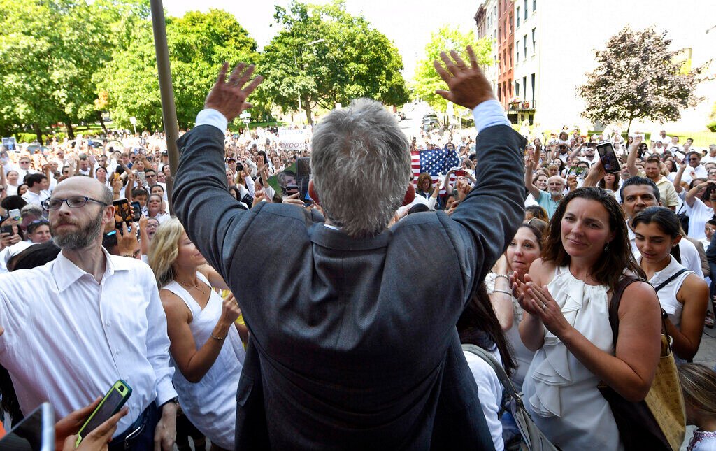 Then, Kennedy hawked his book. If just 300 attendees preordered it on Amazon that night, he told the crowd, it would land on the bestseller list and they could “stick it to Amazon and Jeff Bezos.”