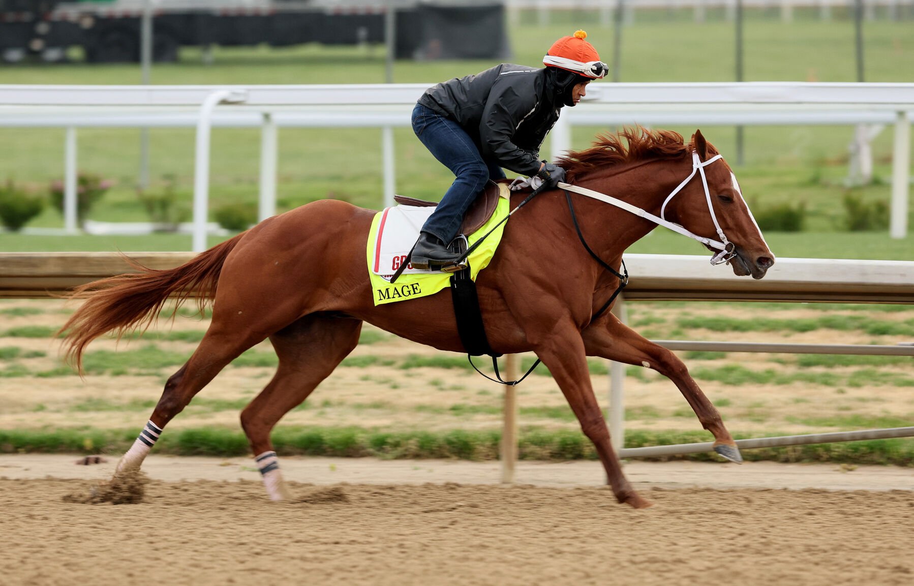 Mage runs on the track during the morning training for the Kentucky Derby at Churchill Downs on April 29, 2023, in Louisville, Kentucky. (Andy Lyons/Getty Images/TNS)