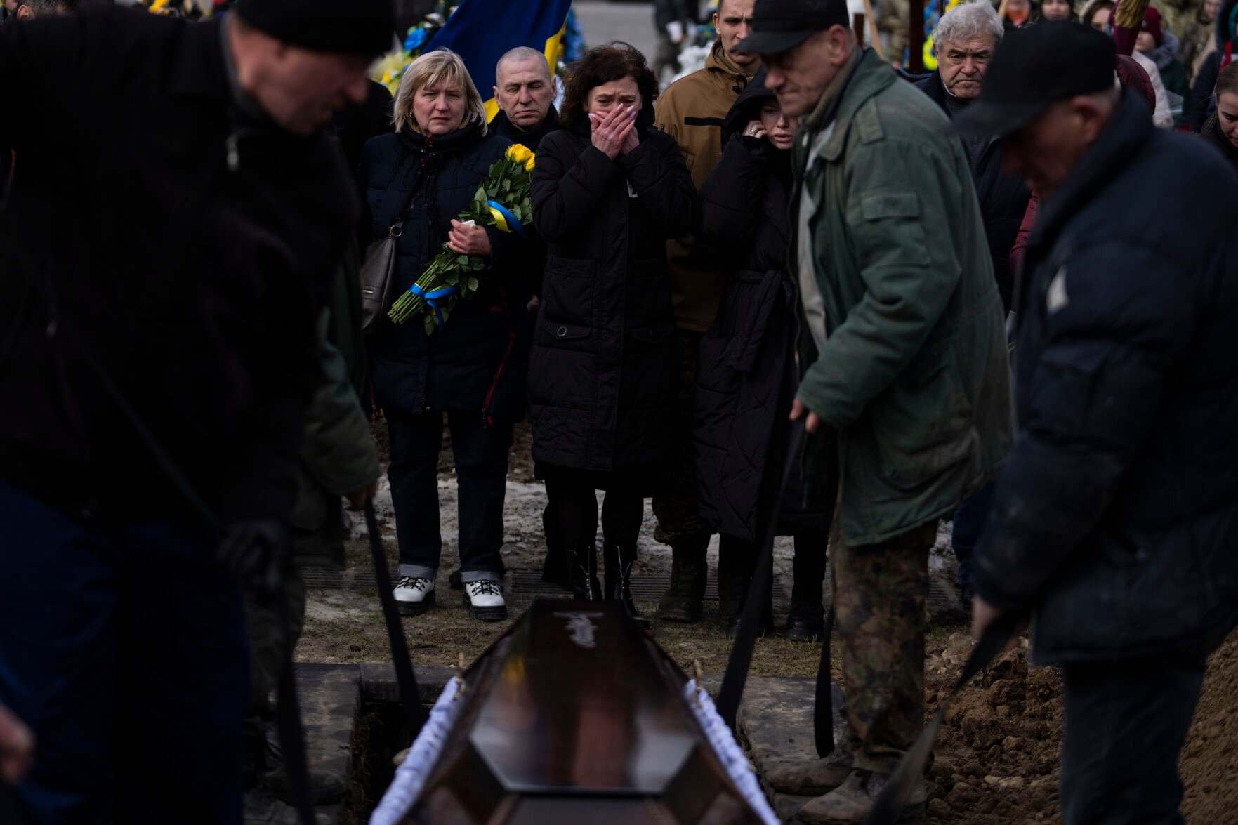 Kateryna, center, the mother of 32-year-old soldier Denys Averiiev reacts Thursday during the funeral of her son at Lviv cemetery in western Ukraine. Averiiev died in Bakhmut on Feb. 16.