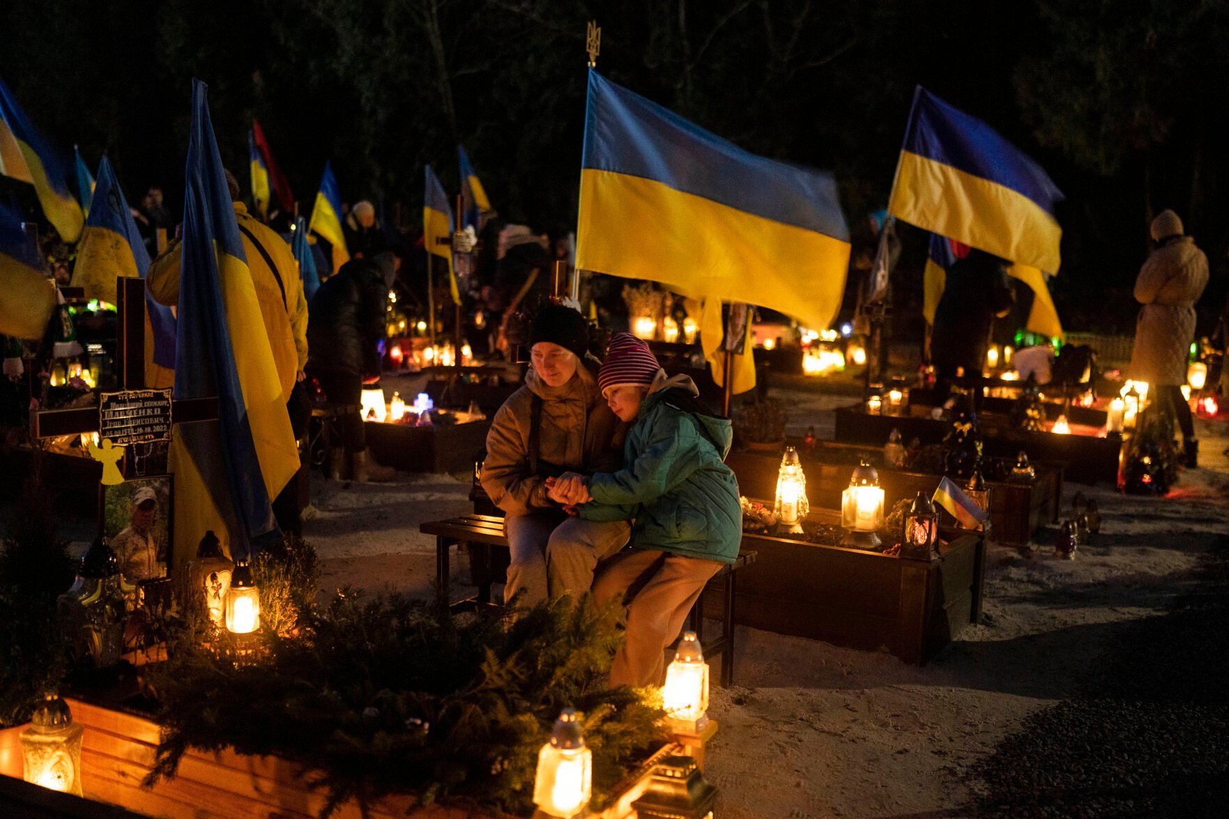 Olesia and her 8-year-old daughter Uliana sit next to the grave of Olesia's husband, Ihor Marchenko, on Thursday at Lviv cemetery in western Ukraine for a "lights of memory" event to honor those who died fighting against the Russian invasion.
