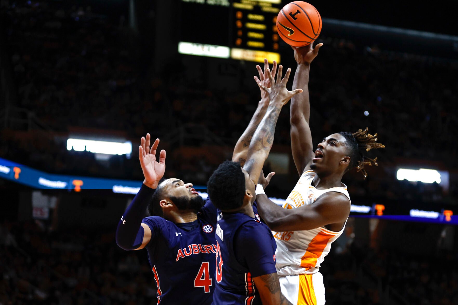 Tennessee guard Jahmai Mashack shoots over Auburn forward Johni Broome and guard K.D. Johnson during the first half of Saturday's game in Knoxville, Tenn.