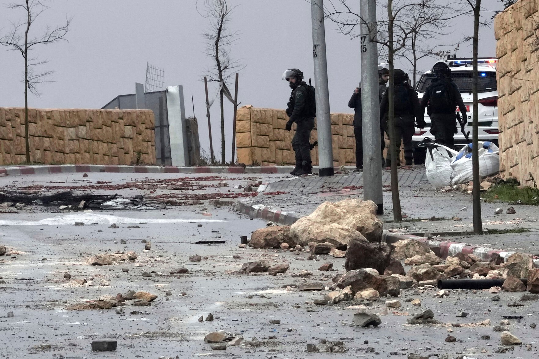 Large stones lie in the street near Israeli police in riot gear during clashes with residents amid demolitions of Palestinian homes by Israeli authorities in the Jabal Mukaber neighborhood of east Jerusalem, Jan. 31, 2023. For many Palestinians, the accelerating pace of home demolitions is part of Israel's new ultranationalist government's broader battle for control of east Jerusalem, claimed by the Palestinians as the capital of their future state. Israel says it is simply enforcing building regulations. (AP Photo/Mahmoud Illean)