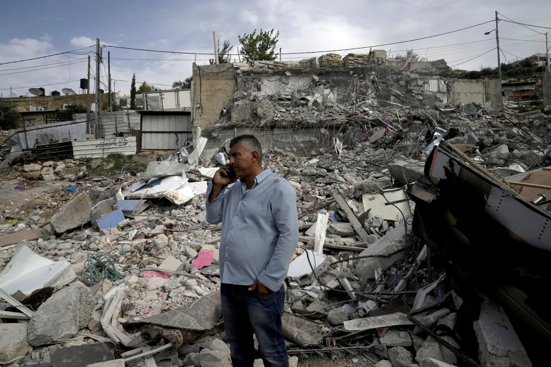 Ratib Matar, a Palestinian whose family home was demolished by Israeli authorities, talks on his mobile phone in the rubble of the home that sheltered 11 people, in the Jabal Mukaber neighborhood of east Jerusalem, Sunday, Jan. 29, 2023. For many Palestinians, the accelerating pace of home demolitions is part of Israel's new ultranationalist government's broader battle for control of east Jerusalem, claimed by the Palestinians as the capital of their future state. Israel says it is simply enforcing building regulations. (AP Photo/Mahmoud Illean)