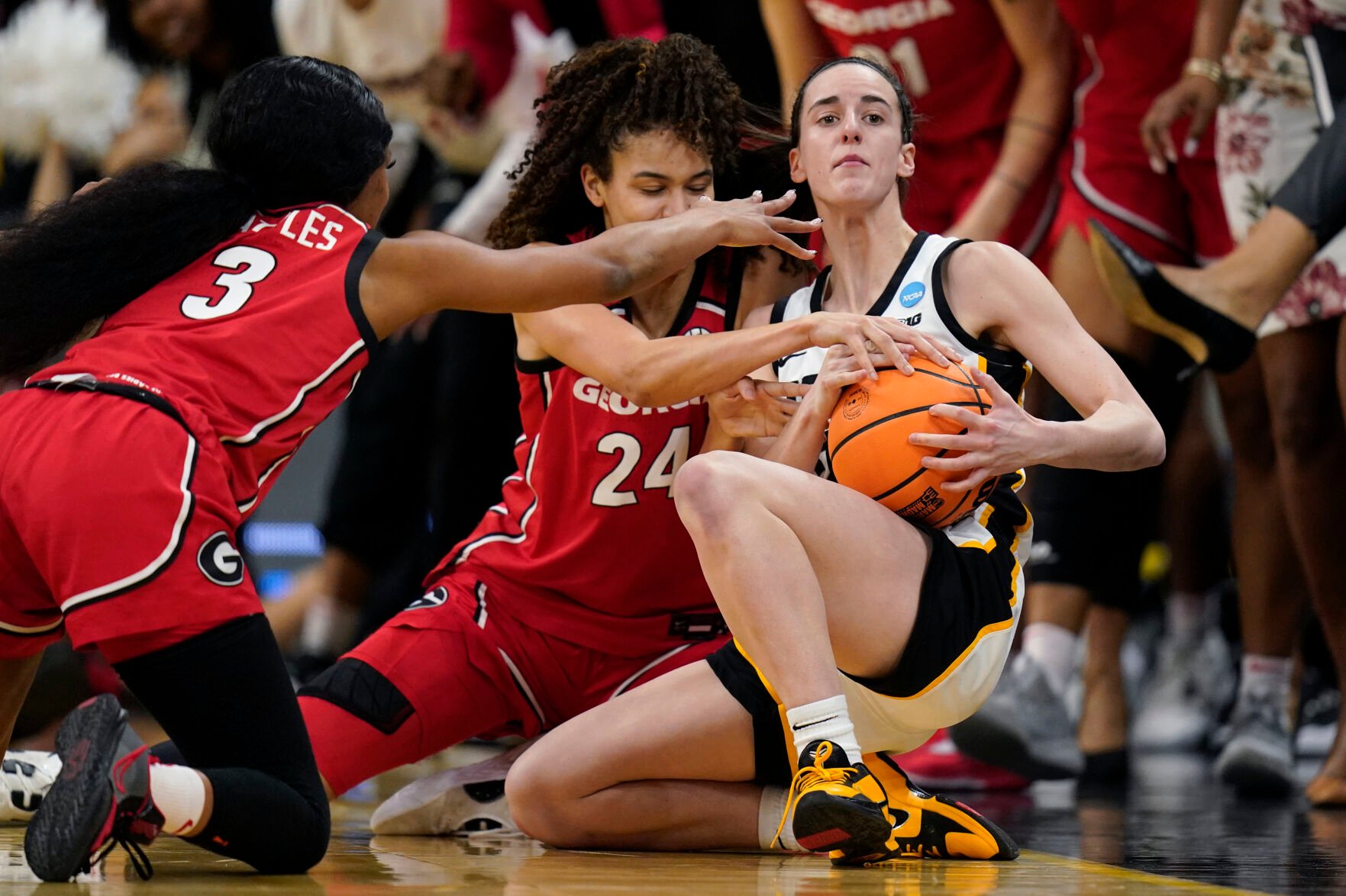 Iowa guard Caitlin Clark, right, fights for a loose ball with Georgia guard Diamond Battles, left, and forward Brittney Smith during a second-round NCAA Tournament game in Iowa City, Iowa.