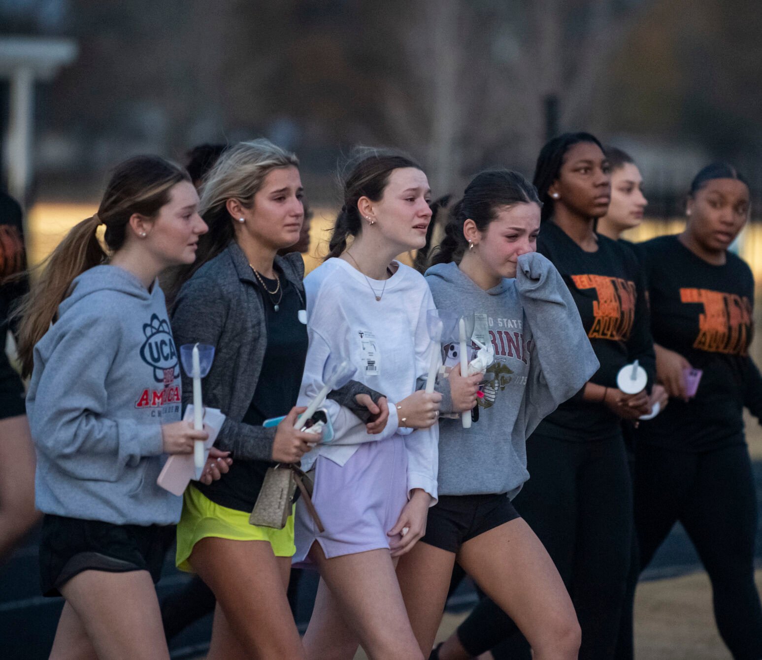 Students walk to the Brusly High School football field for the candlelight vigil for Maggie Dunn and Caroline Gill on Monday, Jan. 2, 2023 in Brusly, La.