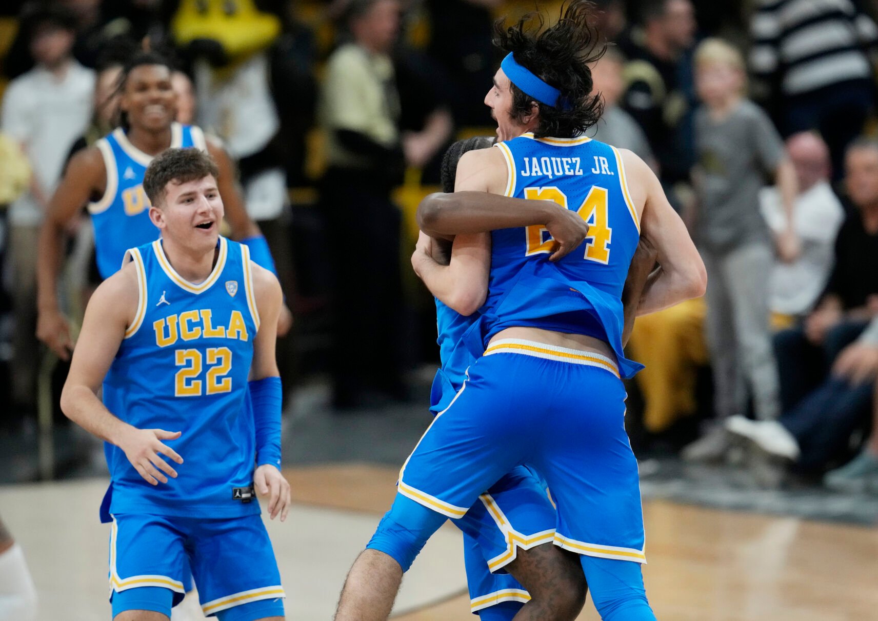 UCLA guard Jaime Jaquez Jr., front right, celebrates with guard David Singleton, back right, as guard Jack Seidler joins in after time ran out in the second half of Sunday's game against Colorado in Boulder,Colo.
