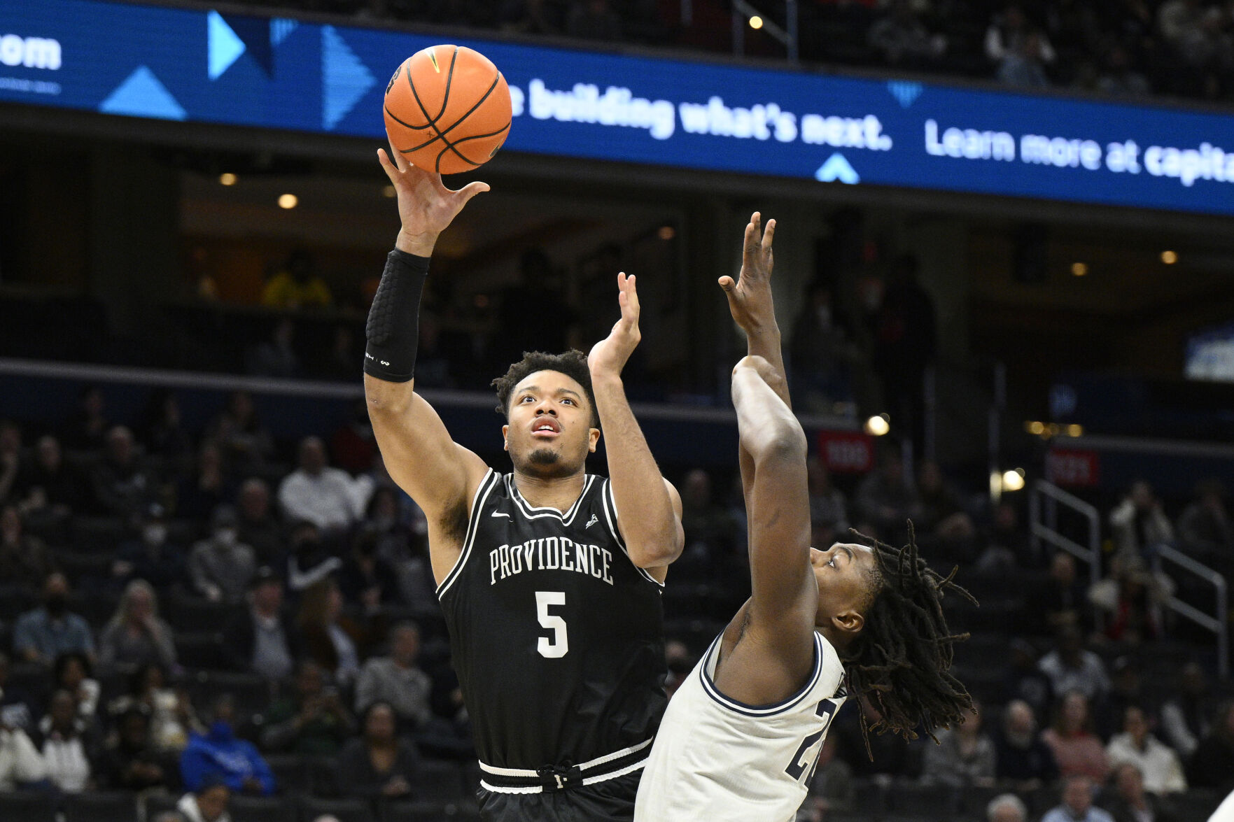 Providence forward Ed Croswell goes attempts a shot while Georgetown forward Bradley Ezewiro, right, defends during the first half Sunday's game in Washington.