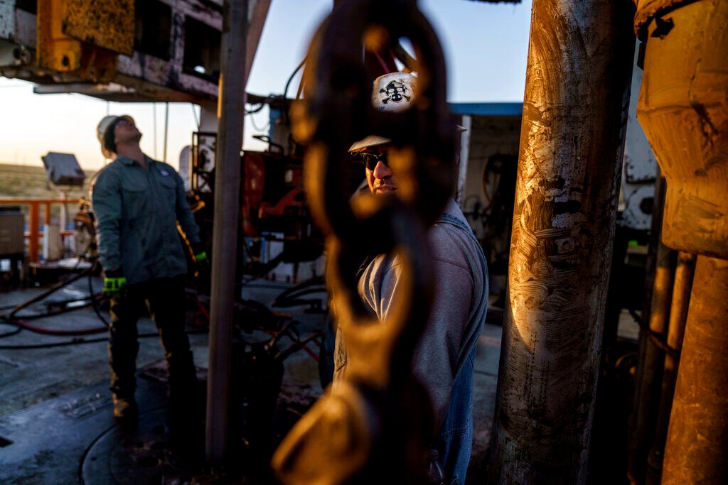 Motorman Danny Perez, right, and forehand Kory Mercantel, work on Latshaw oil drilling rig #43 in Odessa, Texas, Wednesday, Oct. 13, 2021. Most rigs run day and night, with crews of roughnecks rotating in 12-hour shifts.