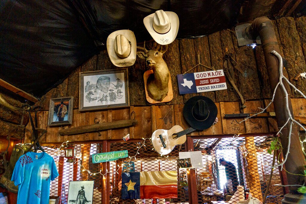 Cowboy hats hang on a deer head next to a portrait of John Wayne at Big John’s Feed Lot in Big Spring, Texas, Friday, Oct. 15, 2021. At the burger and barbecue restaurant the parking lot was filled at lunchtime with gas-guzzling American-made pickup trucks. “Can you imagine anyone in here driving an electric car?” asked Brenda Stansel, the owner, who insisted Trump was still the rightful commander-in-chief. Asked if she believed in climate change, Stansel responded: “I believe in God.”
