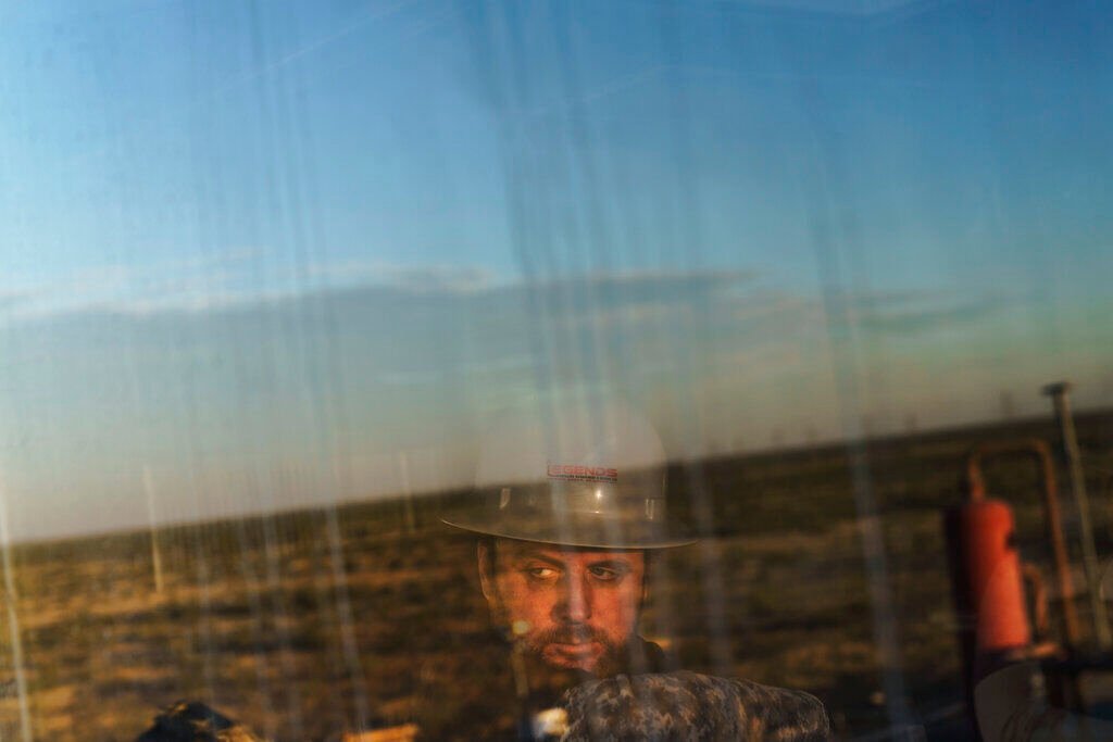 Forehand Kory Mercantel works on Latshaw drilling rig #43 in the Permian Basin in Odessa, Texas, Wednesday, Oct. 13, 2021. The Permian is the top oil and gas producing region in the United States. On any given day, about 500 rigs are drilling new wells within the basin to boost production.