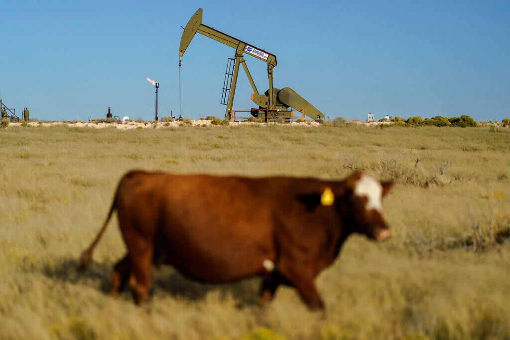 A cow walks through a field as an oil pumpjack and a flare burning off methane and other hydrocarbons stand in the background in the Permian Basin in Jal, N.M., Thursday, Oct. 14, 2021.