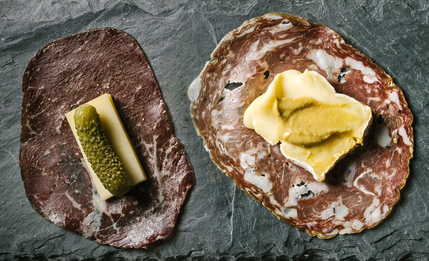 For example, Hallman suggests topping a slice of Petit Jesu pork salami with a small wedge of Brie Fermier Jouvence and a dollop of German mustard, or a piece of bresaola with Swiss cheese and a tangy cornichon.