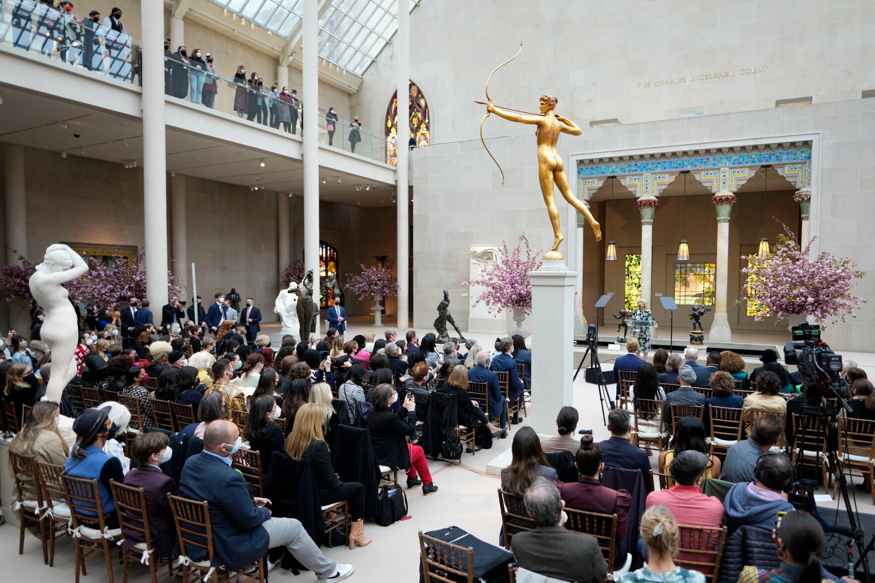 First lady Jill Biden speaks at the unveiling of the Met Museum Costume Institute's exhibit "In America: A Lexicon of Fashion" on Monday, May 2, 2022, in New York. (Photo by Charles Sykes/Invision/AP)