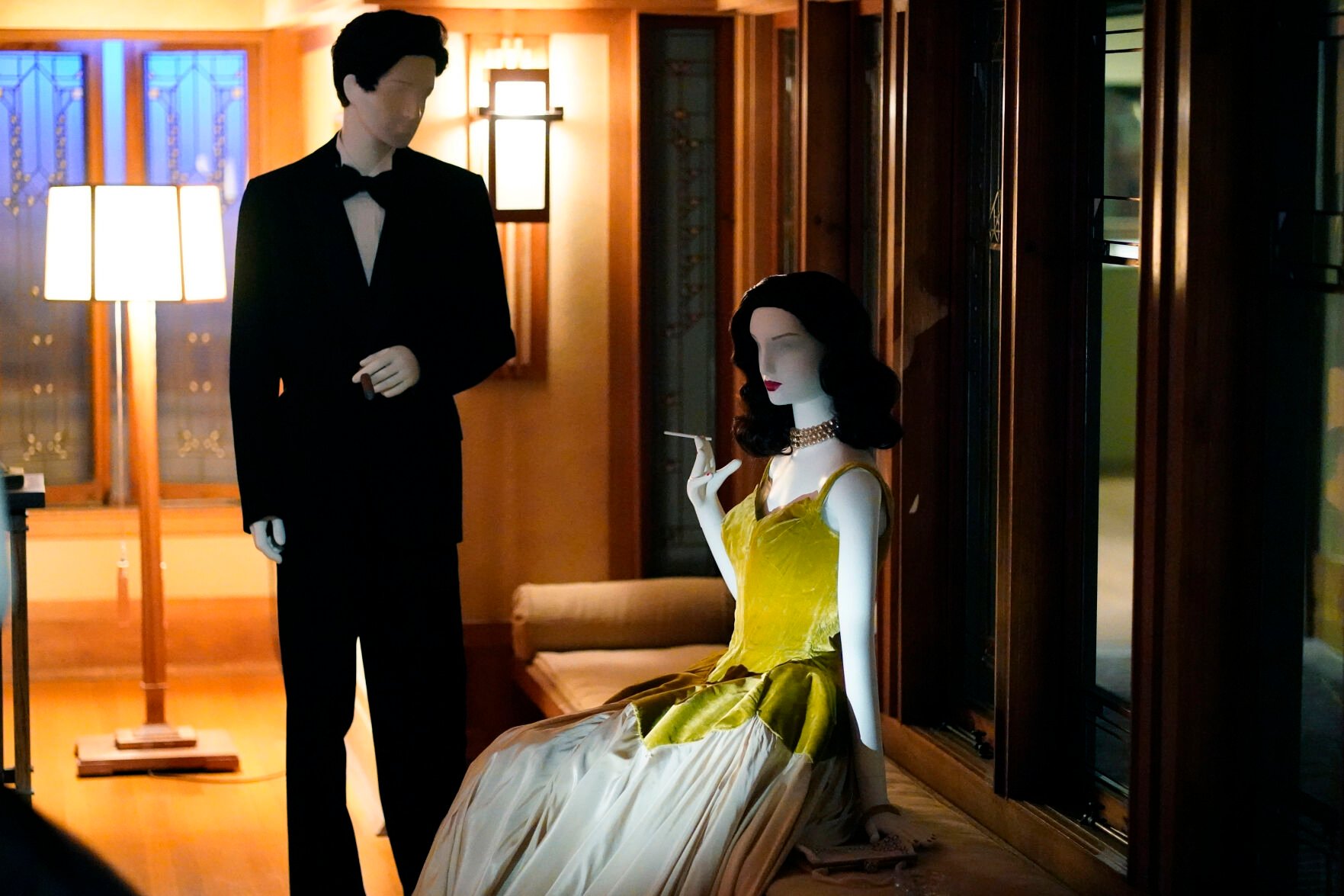 A scene staged by film director Martin Scorsese featuring fashions by designer Charles James and a room by architect Frank Lloyd Wright is displayed as part of the Met Museum Costume Institute's exhibit "In America: A Lexicon of Fashion" during a press preview on Monday, May 2, 2022, in New York. (Photo by Charles Sykes/Invision/AP)