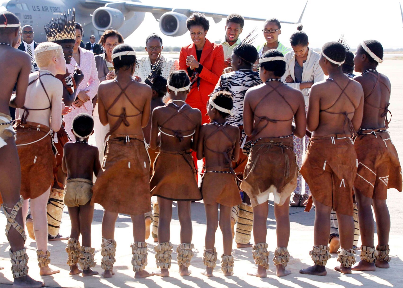 The first lady was feted at the airport by members of some of Namibia’s ethnic groups — clad in red, white and blue, or bright pink — who greeted her with singing, dancing, drumming and ululating. The last high-level U.S. official to visit was Vice President Al Gore in 1996, the White House said.